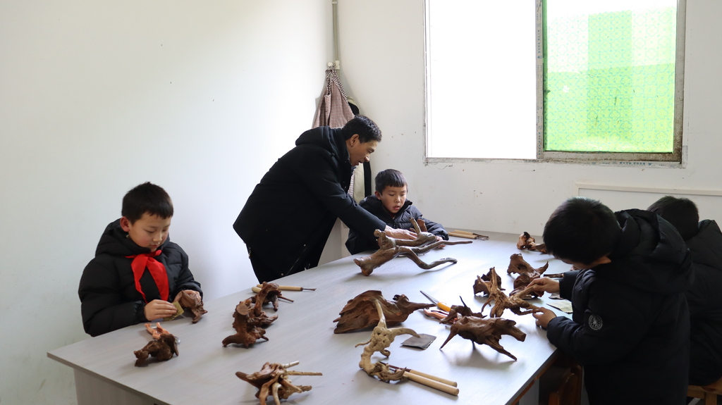 三义乡小学依托山区资源开设根雕课堂,让学生在选材、打磨中感知自然之美与传统技艺,如今根雕已成为校园文化名片。图为近日,老师正指导学生对天然树根进行创意雕琢。