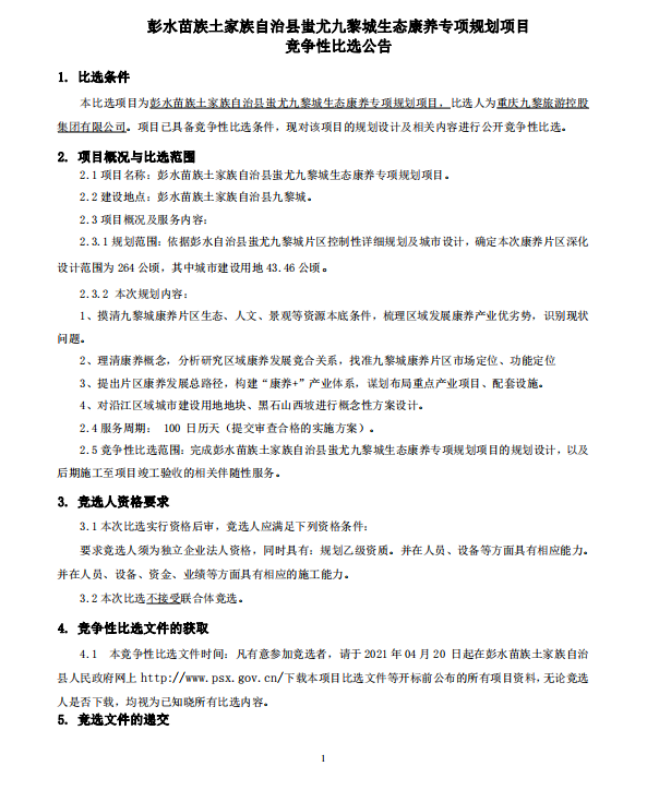 彭水苗族土家族自治县蚩尤九黎城生态康养专项规划项目竞争性比选公告