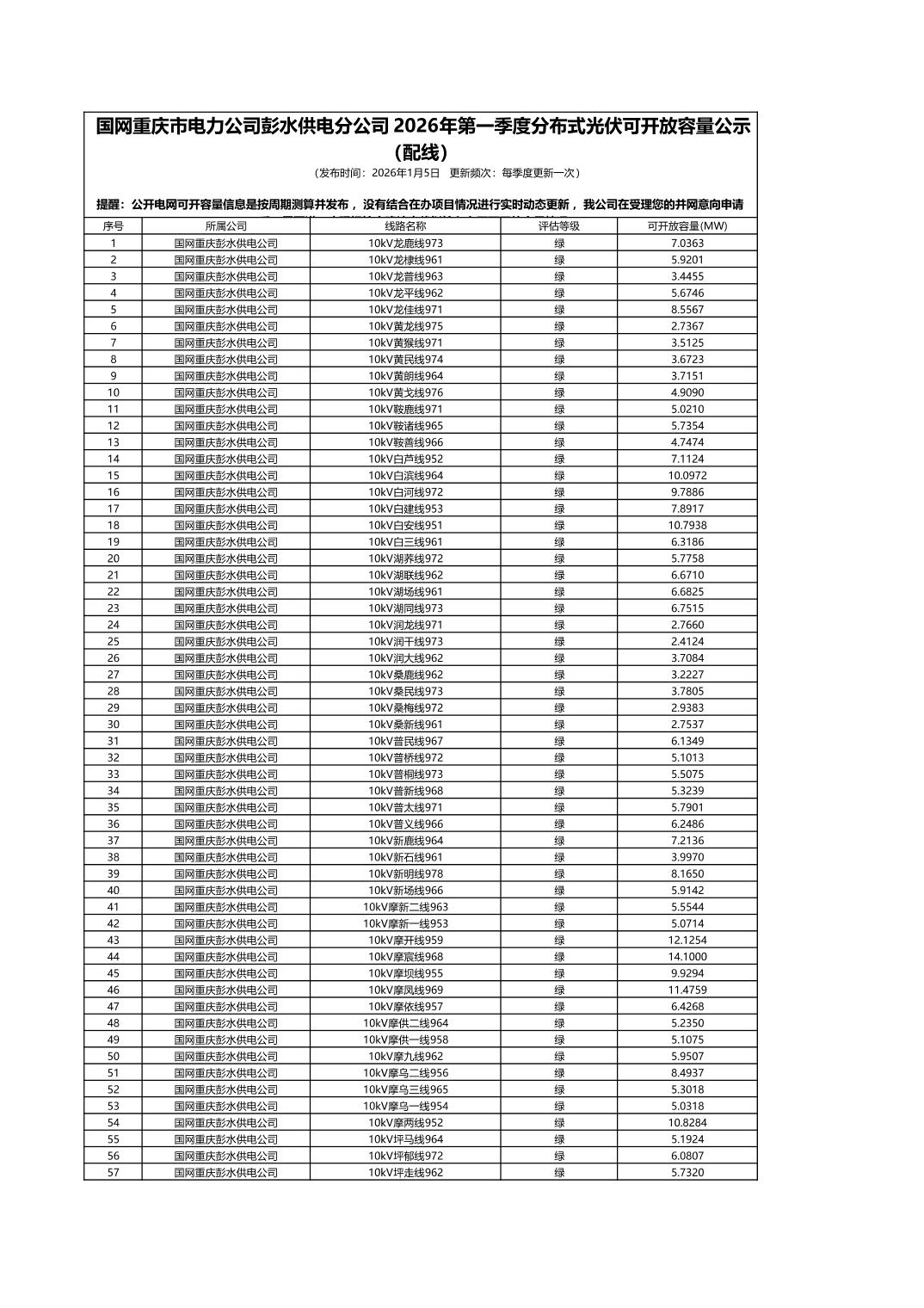 国网重庆市电力公司彭水供电分公司2026年第一季度分布式光伏可开放容量公示(配线)