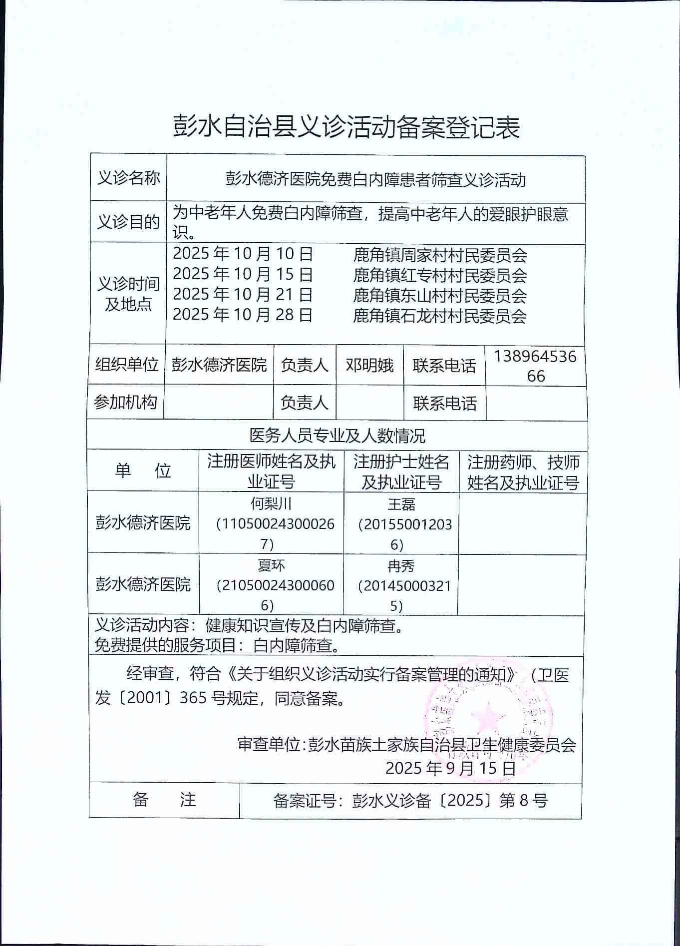 彭水德济医院免费白内障患者筛查义诊活动的备案凭证
