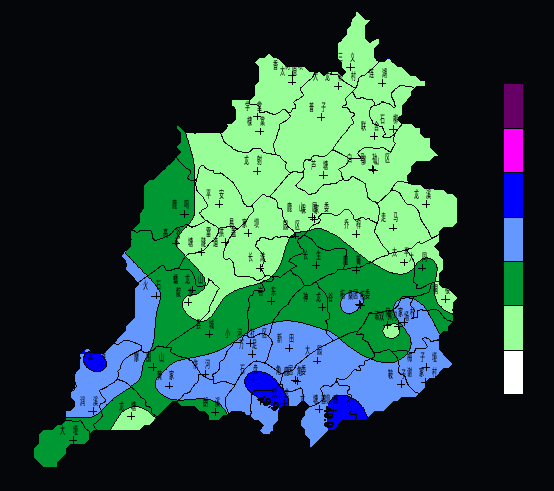 昨日(15日08时到16日08时)我县以阴雨天气为主;其中,善感(63.8mm)、石盘(57.2mm)、润溪龙洋(53.9mm)、双龙(52.3mm)和鞍子何家村(51.8mm)等5个监测点达暴雨,鹿角居委(43mm)、新田(37.7mm)等15个监测点为大雨。城区平均气温18.6℃,最高气温24.2℃,最低气温14.7℃,降水量12.5mm。