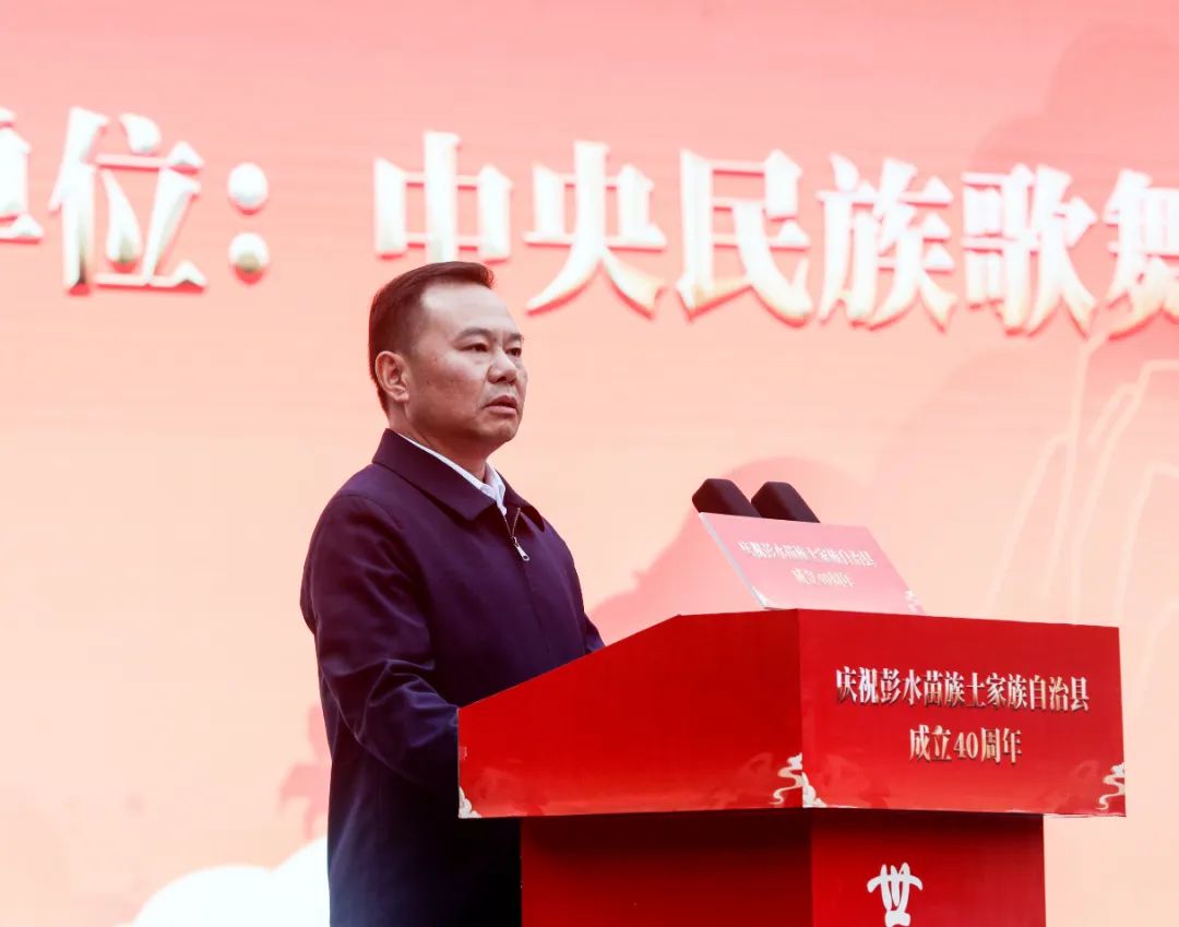 石强代表彭水自治县委、县人大常委会、县政府、县政协,对各位领导、各位来宾的到来表示热烈的欢迎和衷心的感谢,向彭水70万各族人民致以亲切的问候和节日的祝福。石强说,在党的民族政策光辉照耀下,1984年11月,国务院批准成立彭水苗族土家族自治县,从此掀开彭水历史新的华章。40年来,特别是党的十八大以来,在党中央、国务院的亲切关怀和市委、市政府的坚强领导下,历届县委、县政府坚持以铸牢中华民族共同体意识为主线,统筹做好高质量发展、高品质生活、高效能治理各项工作,团结带领全县各族人民打赢脱贫攻坚战、全面建成小康社会,迈上全面建设社会主义现代化国家新征程。