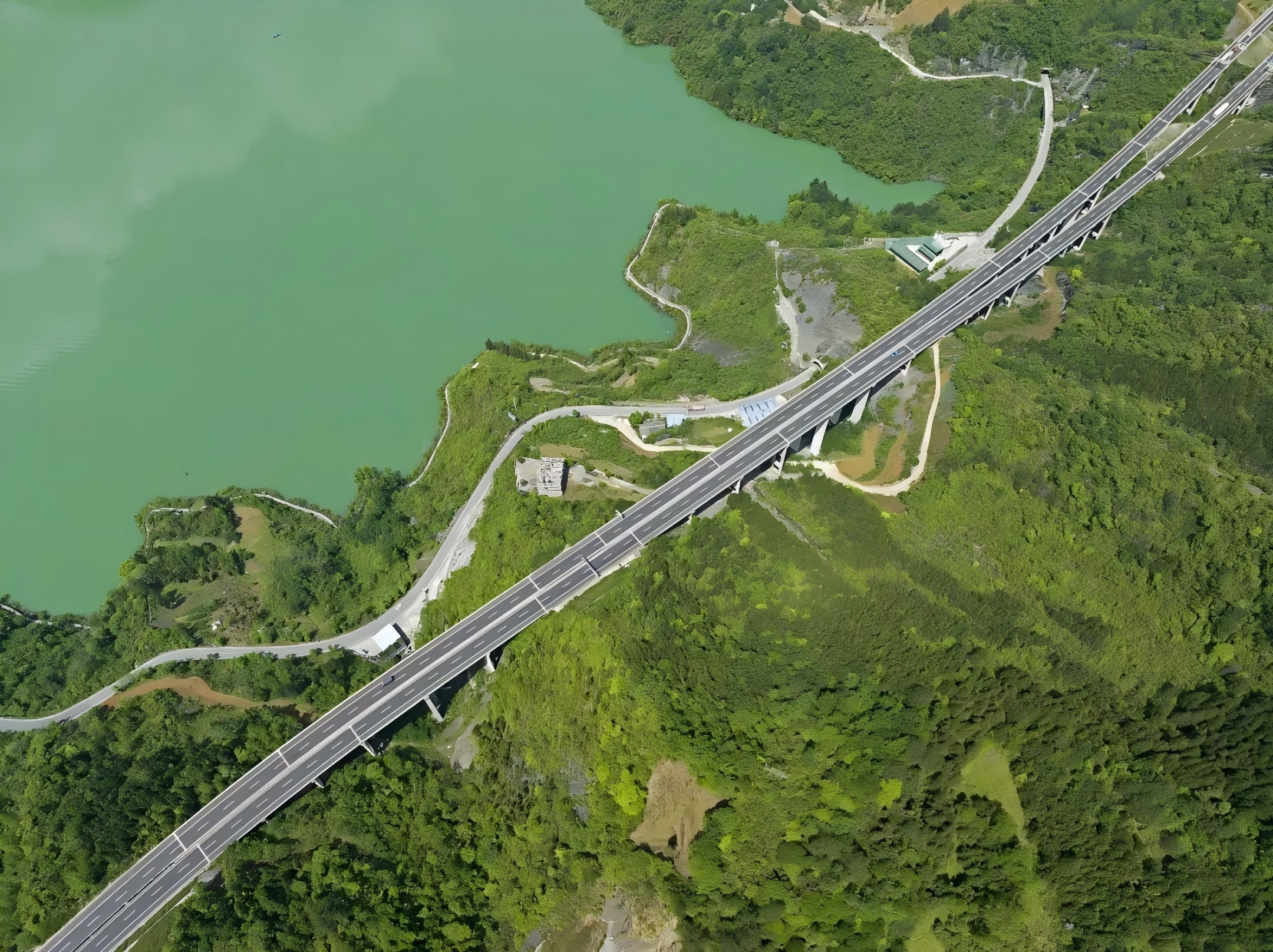 彭水万足镇,渝湘复线高速公路沿着碧绿的乌江穿梭于崇山峻岭之间。