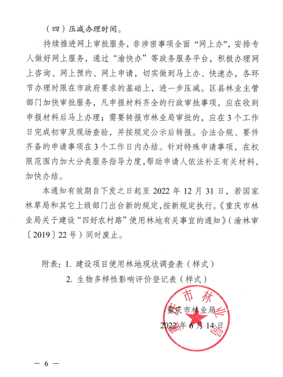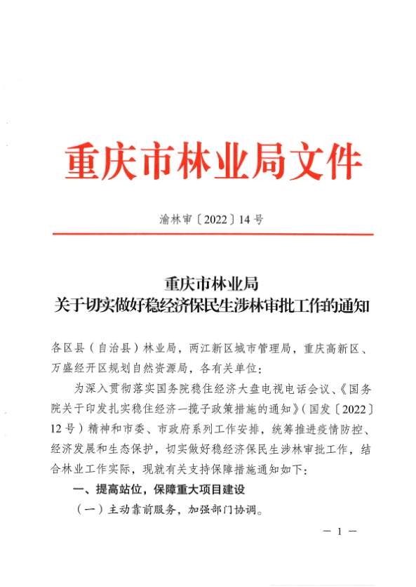附件:重庆市林业局《关于切实做好稳经济保民生涉林审批工作通知》(渝林审〔2022〕14号)