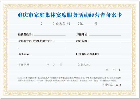 第十条市局统一制定家宴经营者备案卡样式(见附件2)及相关备案文书样式。各区县局按照样式要求自行印制或从“重庆市市场监督管理局智慧食品安全监管服务平台”打印。