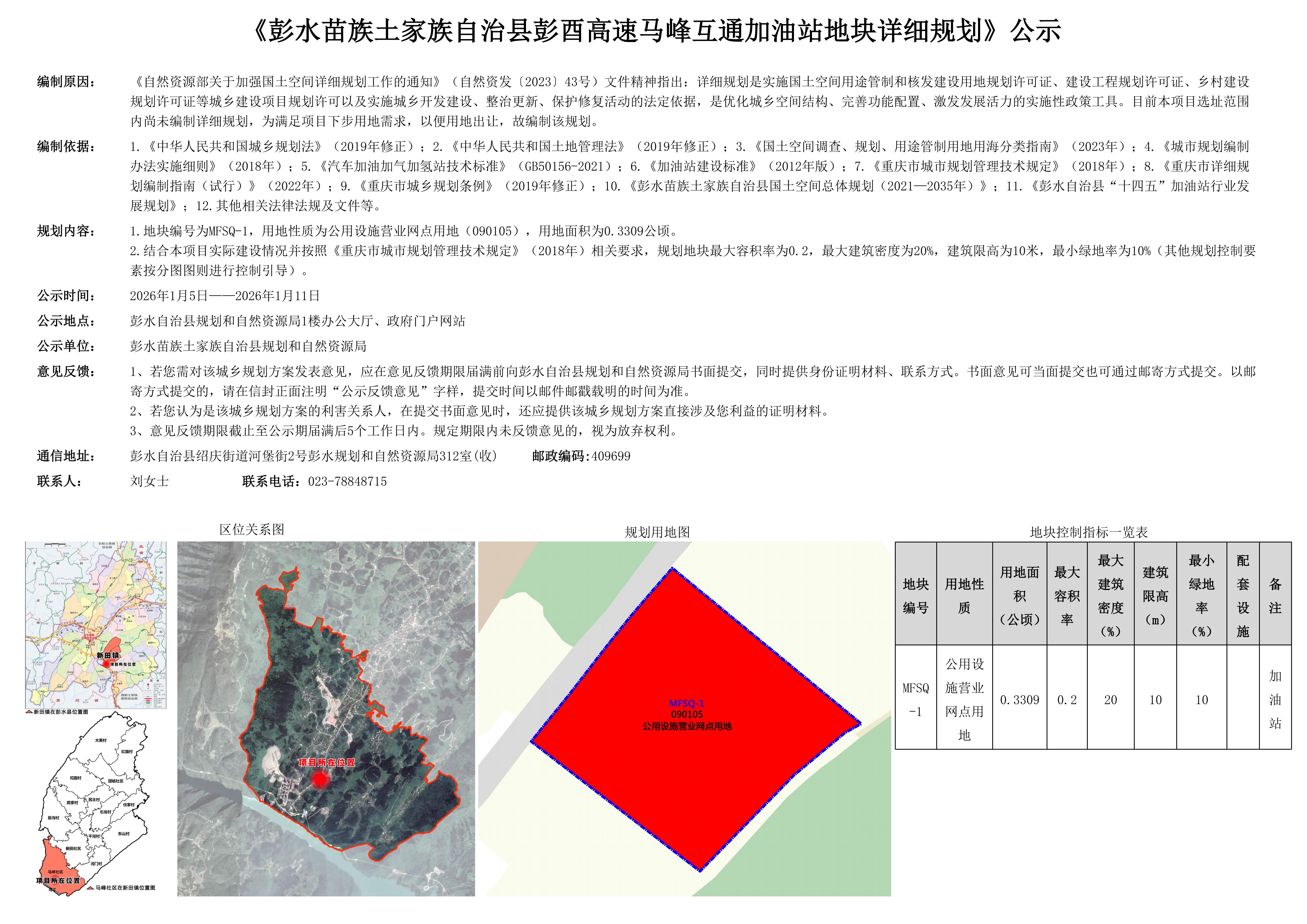 《彭水苗族土家族自治县彭酉高速马峰互通加油站地块详细规划》公示