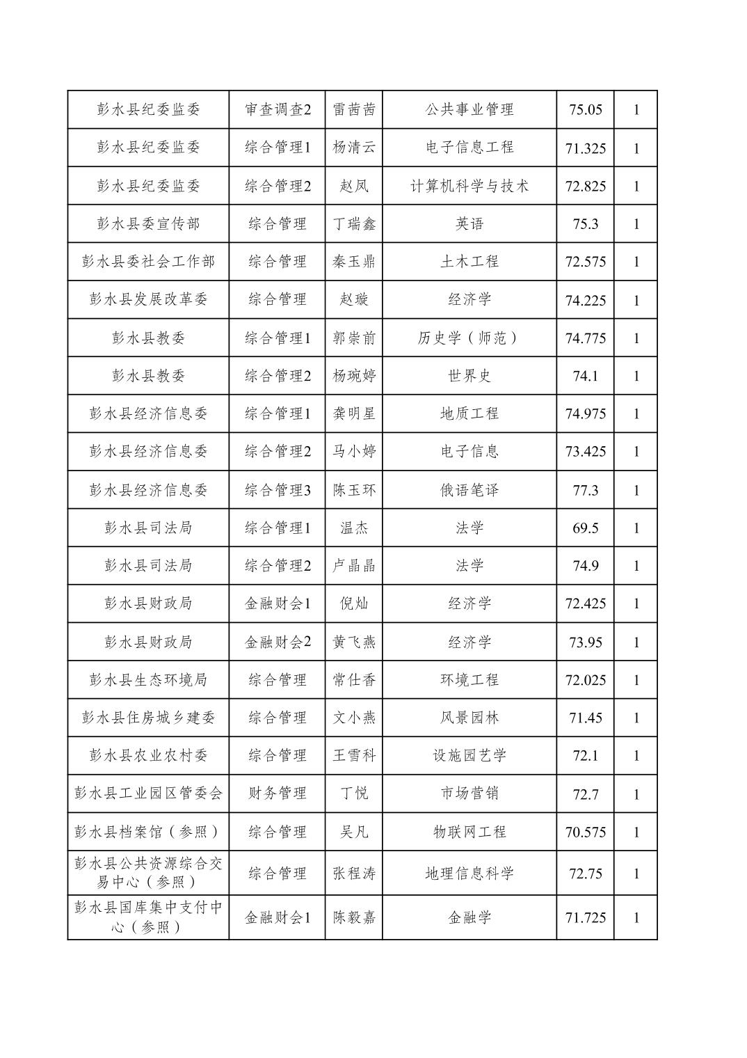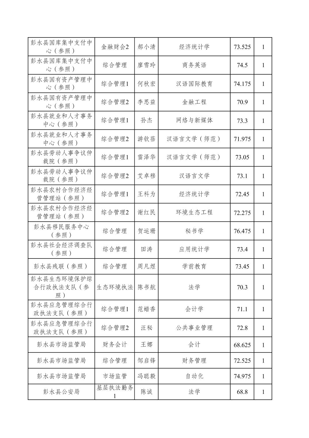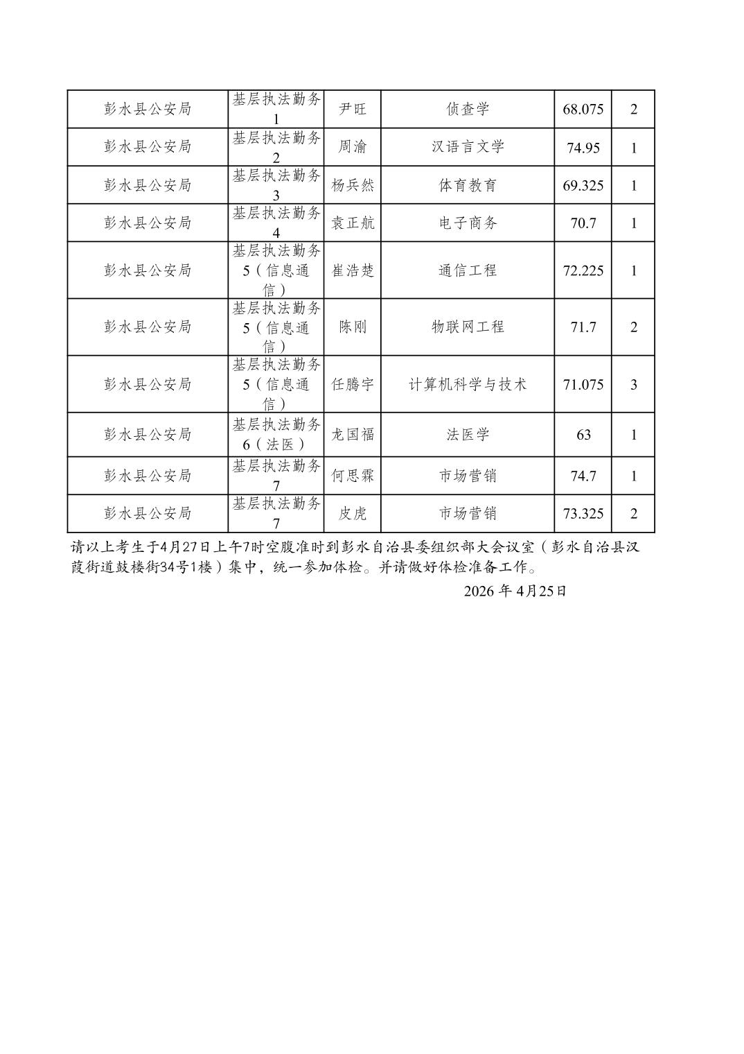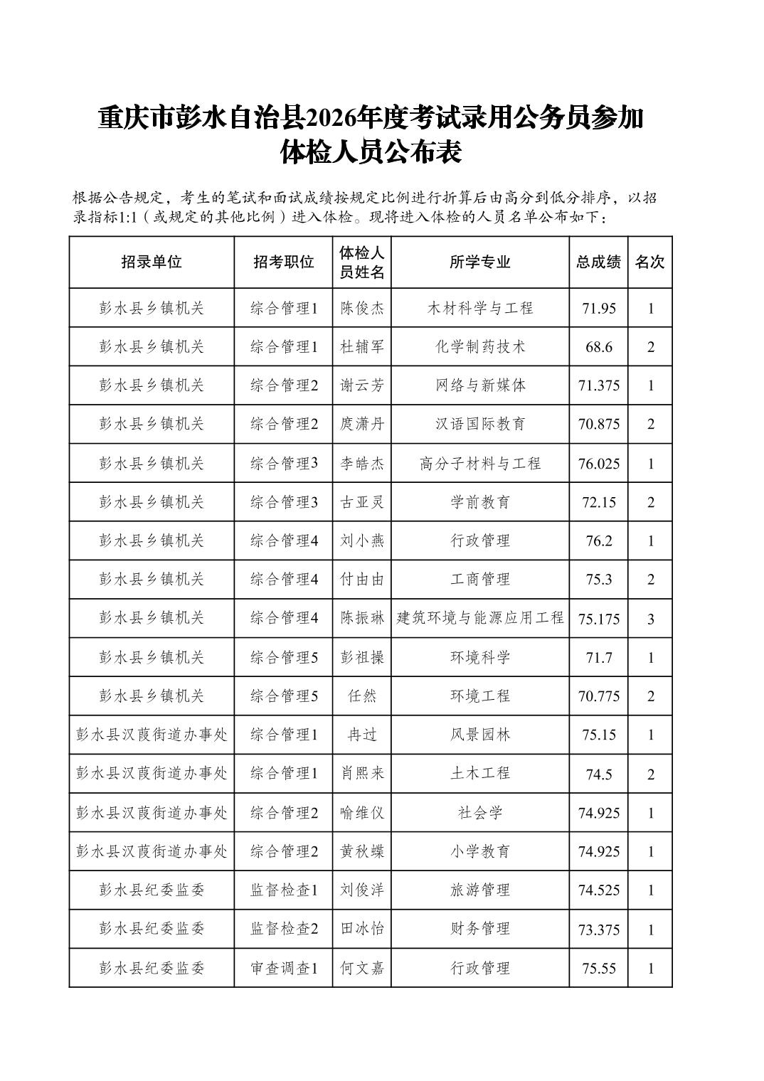 重庆市彭水自治县2026年度考试录用公务员参加体检人员公布表