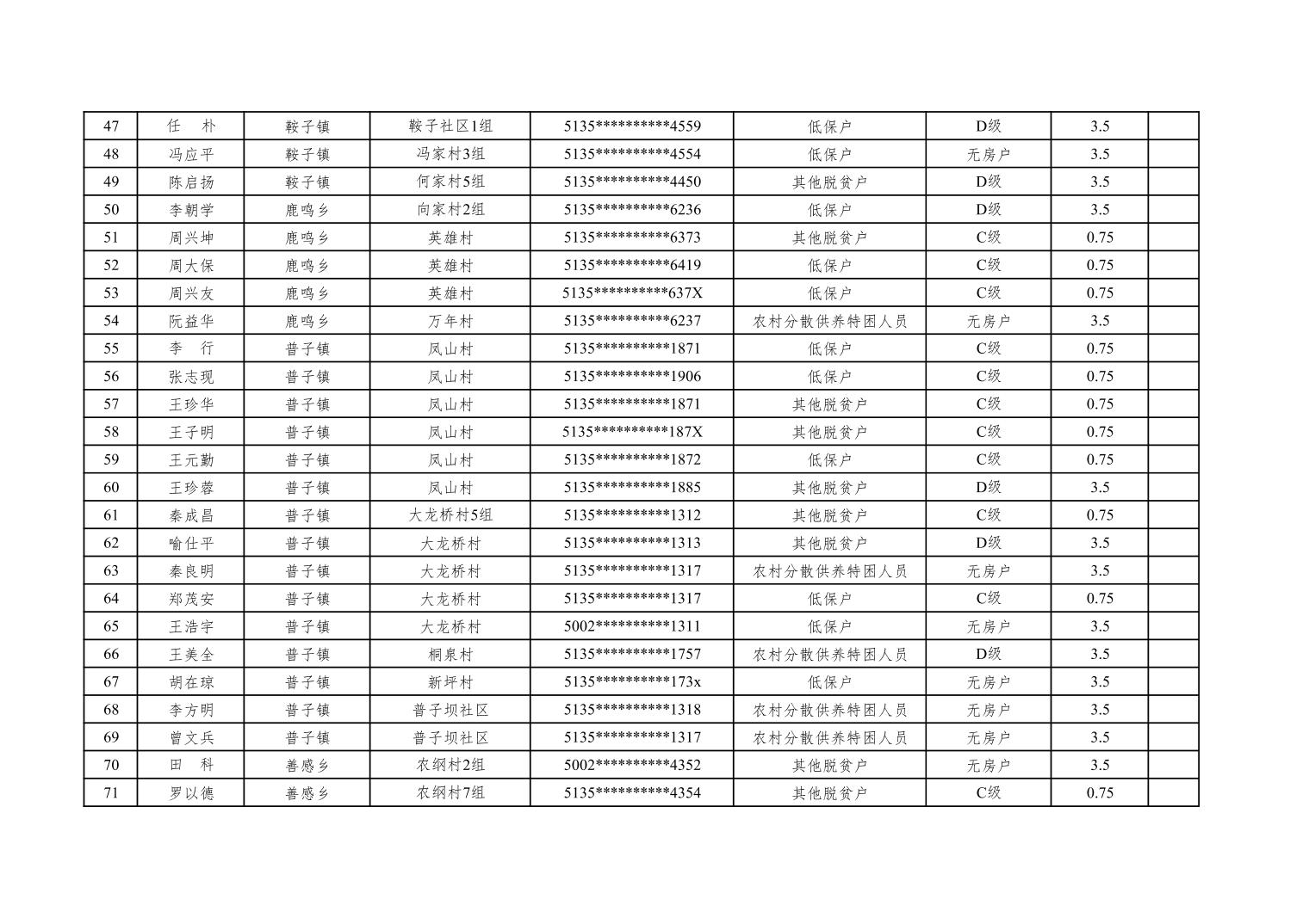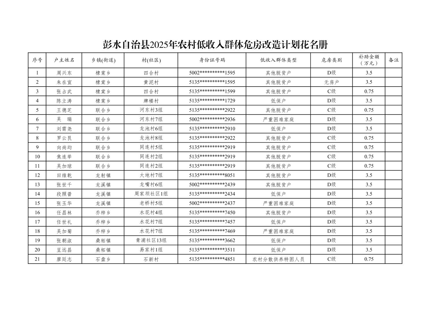 彭水自治县2025年农村低收入群体危房改造计划花名册